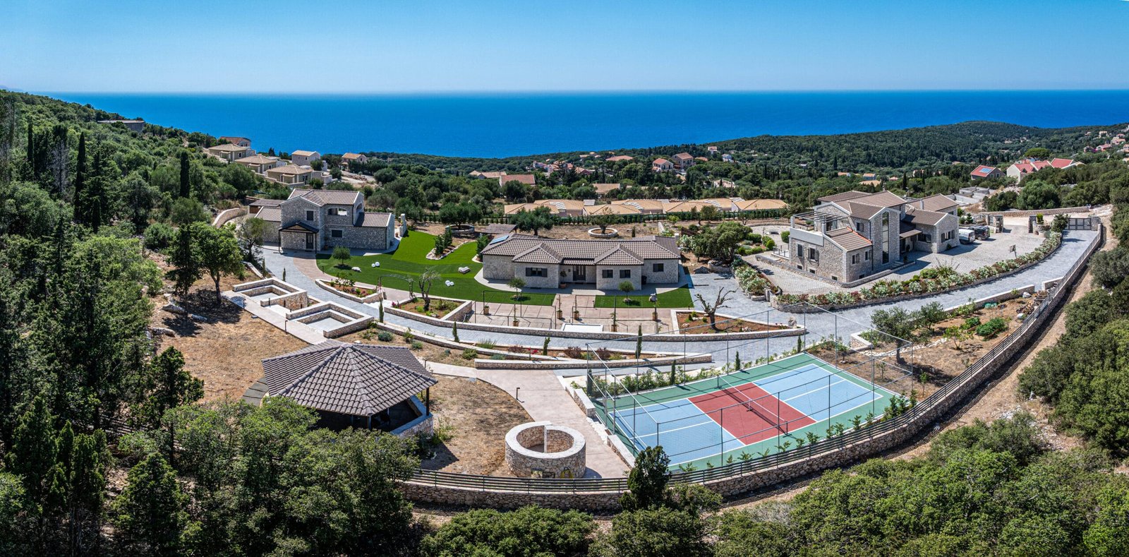 Explore Horizon Retreat’s Hexagon outdoor gym, serene Vesper Lounge in the forest, organic Perivoli garden, and pickleball Court for fitness, relaxation, and recreation in Kefalonia.